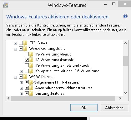 Der Webserver von Microsoft, kurz IIS kann auf einem Windows Server (Windows NT - 2012R2) oder Clientbetriebssystem (Windows XP - 8) als Windows Feature nachinstalliert werden: