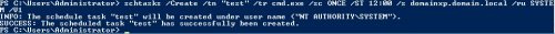 schtasks /create /tn "mytaskname" /sc ONCE /ST 12:00 /s REMOTEHOSTNAME /ru SYSTEM /TR BEFEHL /V1