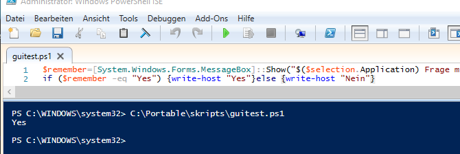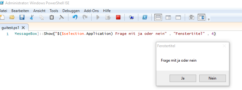 $remember=[System.Windows.Forms.MessageBox]::Show("$($selection.Application) Frage mit ja oder nein" , "Fenstertitel" , 4)