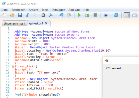 Innerhalb von Funktionen, hier $timer_Tick, ist ein anderer Gültigkeitsbereich für Variablen (Scope). Um mit $i++ die Variable $i dauerhauft um eins zu erhöhen, muss $i in einem Scope verwendet werden der auch außerhalb der Funktion gültig ist. Beispiele dafür sind $global:i oder $script:i Ohne "global" oder "script" würden Änderungen an $i in einer Funktion nicht gespeichert werden, daher würde die Änderung an $i innerhalb von $timer_Tick immer wieder verloren gehen: $i würde dann zu Beginn der Funktion $timer_Tick 0 sein und immer wieder um 1 erhöht also bei jedem Durchlauf der Funktion von 0 auf 1 erhöht werden. Durch Einsatz vom Gültigkeitsbereich:script wird die Variable auch nach dem Ausführen der Funktion gespeichert. $i wird somit mit jedem Funktionsaufruf um eins erhöht 1,2,3,4,5 ....