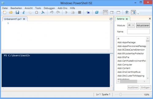 In der oberen Hälfte befindet sich der Quellcode, die untere Hälfte zeigt die PowerShell-Befehlszeile und im rechten Bereich können PowerShell-Befehle gesucht und eingefügt werden: