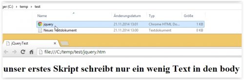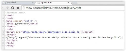 da JavaScript und somit jQuery vom Browser interpretiert wird, benötigen wir zum testen keinen Webserver, es reicht eine Datei mit folgendem Inhalt zu erstellen und diese per Browser zu starten: