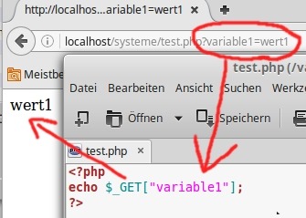 Wird an die URL ein ? mit dem Variablennamen=Wert angegeben, kann der Inhalt dieser Variable in PHP ausgelesen und verarbeitet werden.