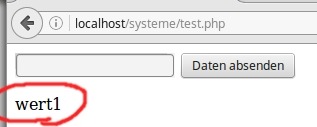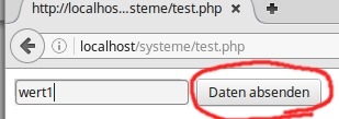In HTML werden die Formulardaten dann an den PHP-Quellcode derselben oder einer anderen Datei übergeben (hier dieselbe Datei: test.php):