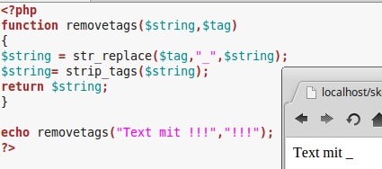 echo removetags("Text mit !!!","!!!");